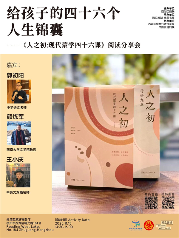在这个功利化、绩效化、碎片化的时代里,我们往往太注重成绩单上的数字,却忽略了真正滋养一个孩子的,是人格与精神。《人之初:现代蒙学四十六课》的诞生,不是为了应试,而是为孩子准备了四十六个精神行囊,那些关乎自爱、自省、尊严、理性、敬畏的课程,让他们在成长的路上,逐渐成为一个更立体的人。本周六,中学语文名师郭初阳、南京大学文学院教授颜炼军、中英文双栖名师王小庆三位“锦囊引路人”齐聚阅见西湖,他们将一起聊聊成长、教育,以及那句从小背到大的“人之初”。