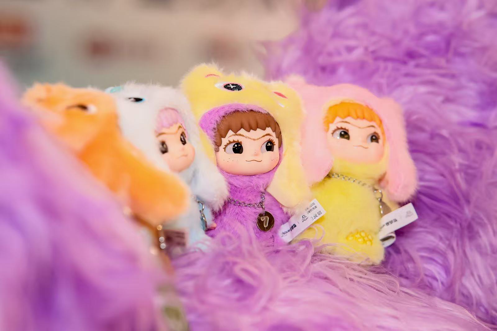界面新闻在今年多个潮玩展会、以及潮玩集合店观察到,有将近八成的IP纷纷穿上了“毛绒皮套”,以毛绒玩偶包挂的产品出现。一方面这的确迎合了市场需求,但另一方面,对于刚诞生的IP来说,千篇一律用毛绒皮套包裹可能并不利于设计形象的完整展示,也很难让消费者一眼抓住。