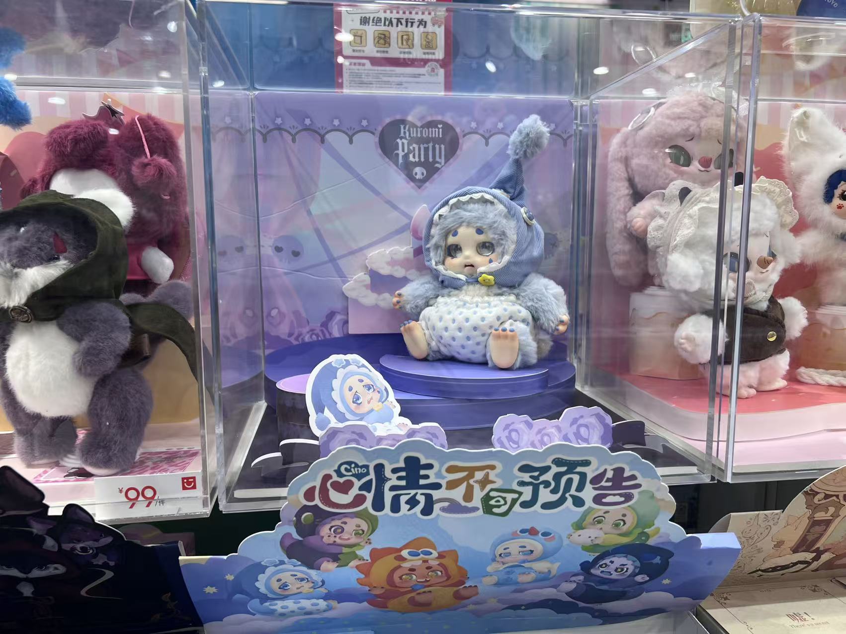 在销售上,不同于泡泡玛特的直营模式,奇梦岛旗下IP此前的大部分曝光也都依赖于合作渠道。比如它主要覆盖线下超过1万家的零售终端,包括名创优品、KKV、三福等,而它的主力IP SIINONO的首发,就曾经放在了名创优品位于上海南京东路的“全球壹号店”。