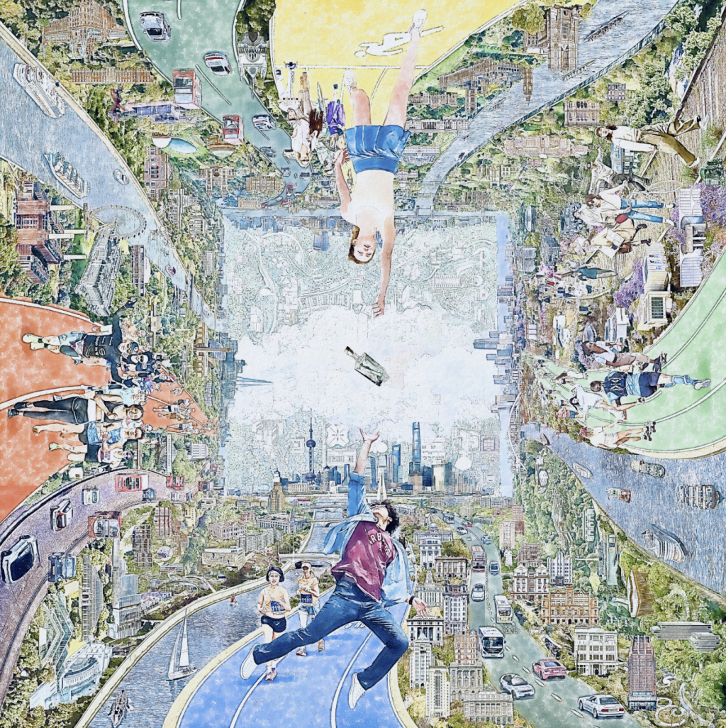 以巨型油画为核心,融入数字艺术叙事逻辑,深耕中英两城文化对话与历史交融命题。作品以“水”为精神纽带,串联黄浦江、苏州河与泰晤士河的流淌脉络,借漂流瓶意象传递跨时空共鸣,寓意两国新一代的文化联结与精神传承。