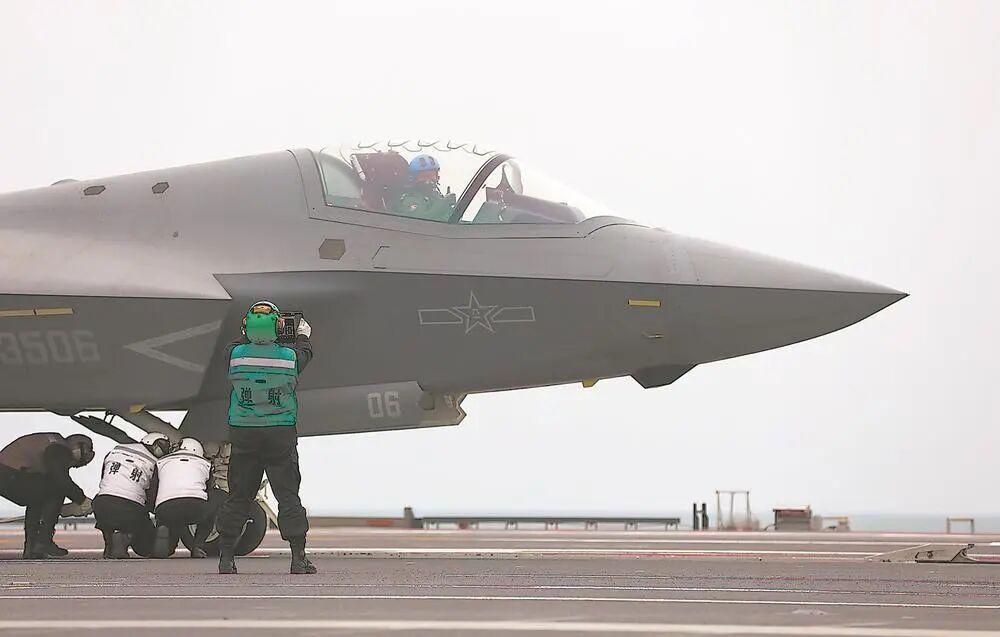 歼 -35 舰载战斗机在福建舰上电磁弹射起飞前,重量板操作员向飞行员核对弹射重量 图:新华社