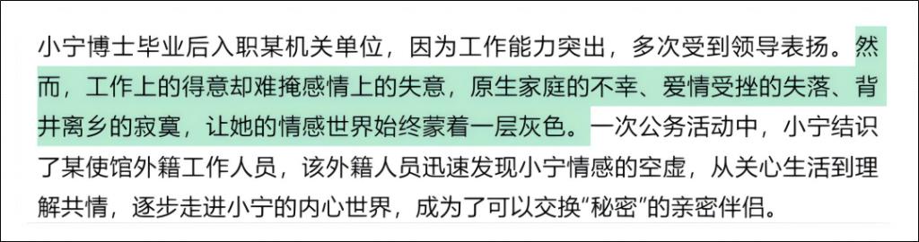 比如,案件是因情而生,因情而生是因为小宁情感空虚,小宁情感空虚的原因在文章里这么表述: