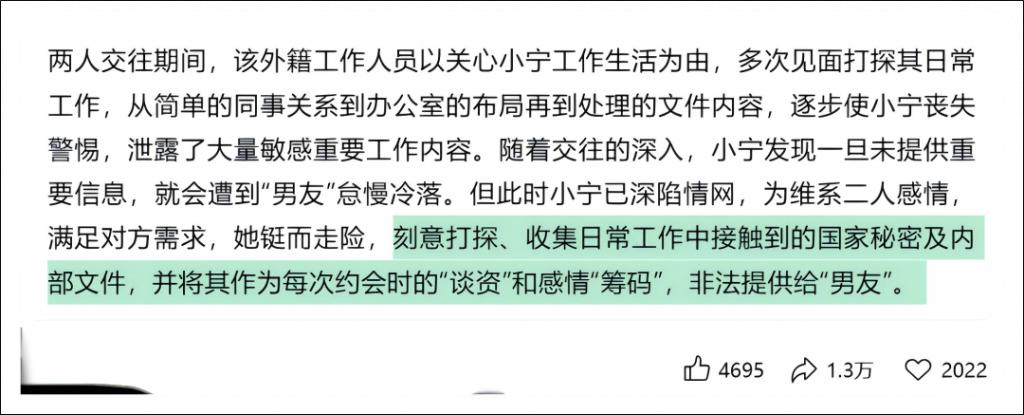 再比如,小宁没有及时悬崖勒马,她害怕境外男友有情绪,主动去找机密来泄。就像文章里写的:
