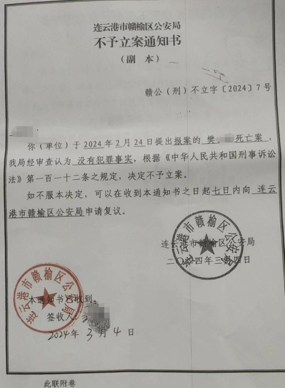 2024 年 3 月 4 日,赣榆区公安局出具《不予立案通知书》," 我局经审查认为没有犯罪事实,决定不予立案。" 警方调查后发现,刘某与樊蕊系情人关系。