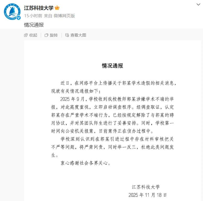 目前江科大作出情况通报,称已认定郭某存在严重学术不端行为,已解除了与郭某的聘用协议,同时向公安机关报案。目前郭伟因涉嫌学术造假、侵占国家科研经费等问题被警方带走。但江科大的这份通报,实在有点 " 后知后觉 ",也让这所高校颜面扫地。