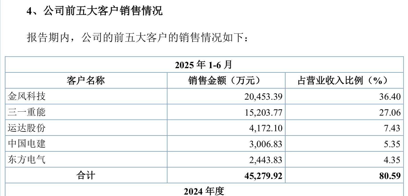 然而,这种客户结构也带来了依赖风险。2025年上半年,公司前五客户销售额(同一控制下口径)占营业收入比例高达80.59%。其中第一大客户金风科技贡献了2.05亿元,第二大客户三一重能贡献了1.52亿元,两个大客户合计占比大约63%。