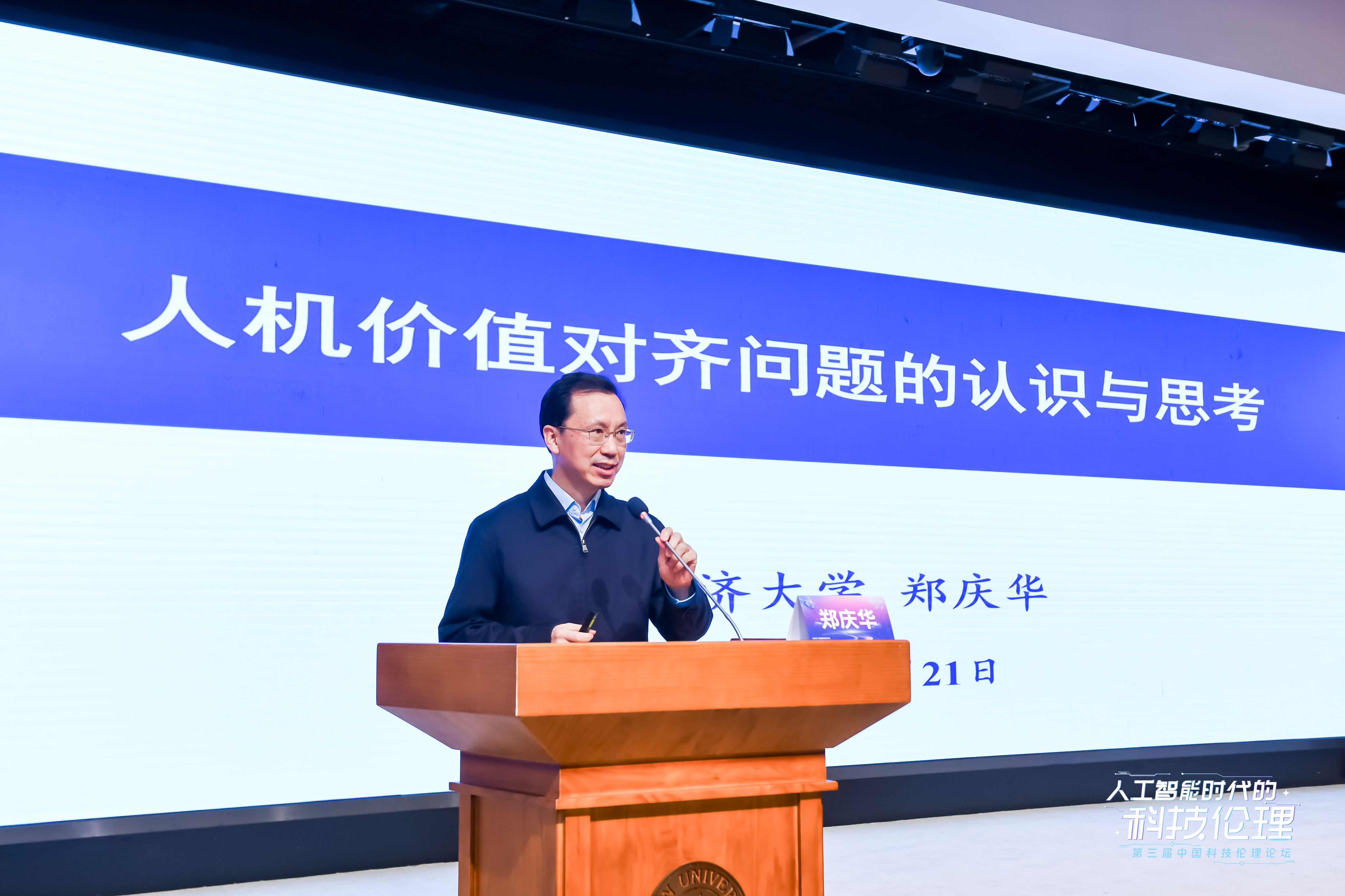 最后,郑庆华院士带来题为“人机价值对齐问题的认识和思考”的特邀报告。目前,人工智能的价值对齐问题已是社会面临的核心挑战之一。郑庆华认为,人工智能技术快速发展伴随着算法偏见、人工智能幻觉与知识产权模糊等诸多风险,而这背后的根本症结在于人类价值观的复杂模糊与人工智能追求目标的精确性间存在冲突。关于如何破局,郑庆华提出,人与人工智能应双向对齐:人工智能需通过人类反馈强化学习实现价值观校准,而人类则需适应人机协同的新范式。最终实现人机价值对齐需构建一个多维度、持续演进的体系,推动技术、治理与文化三方携手共进。