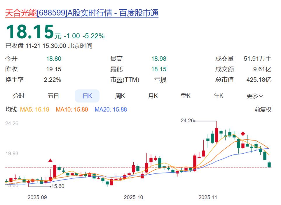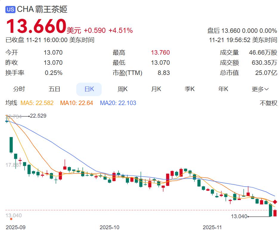 11 月 21 日,霸王茶姬股价大涨,截至收盘涨 4.51%,总市值 25.07 亿美元(约合人民币 178 亿元)。与此同时,天合光能股价却迎来三连跌,截至收盘跌超 5%,总市值 425.18 亿元。
