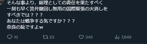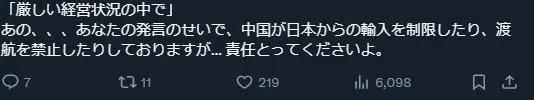 帖文大意:因为你的发言,中国限制了日本商品进口、不鼓励赴日出行,请承担责任。