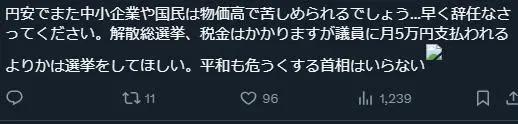 帖文大意:日元贬值将让中小企业和民众再次饱受物价上涨之苦 ……(高市)尽快辞职。