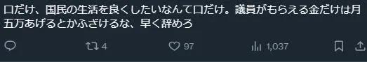 帖文大意:只会空谈改善民生,却给议员每月涨 5 万(日元)工资,太荒唐了,赶紧辞职!