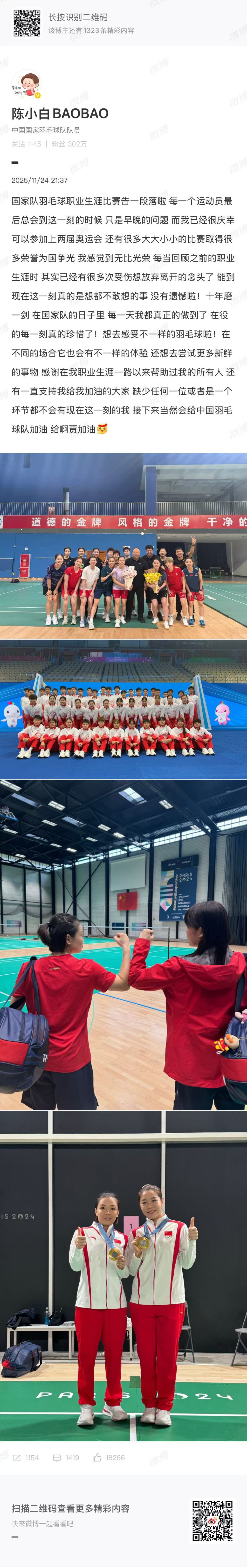 北京时间11月24日晚间,中国羽毛球运动员陈清晨发文表示从国家队退役。
