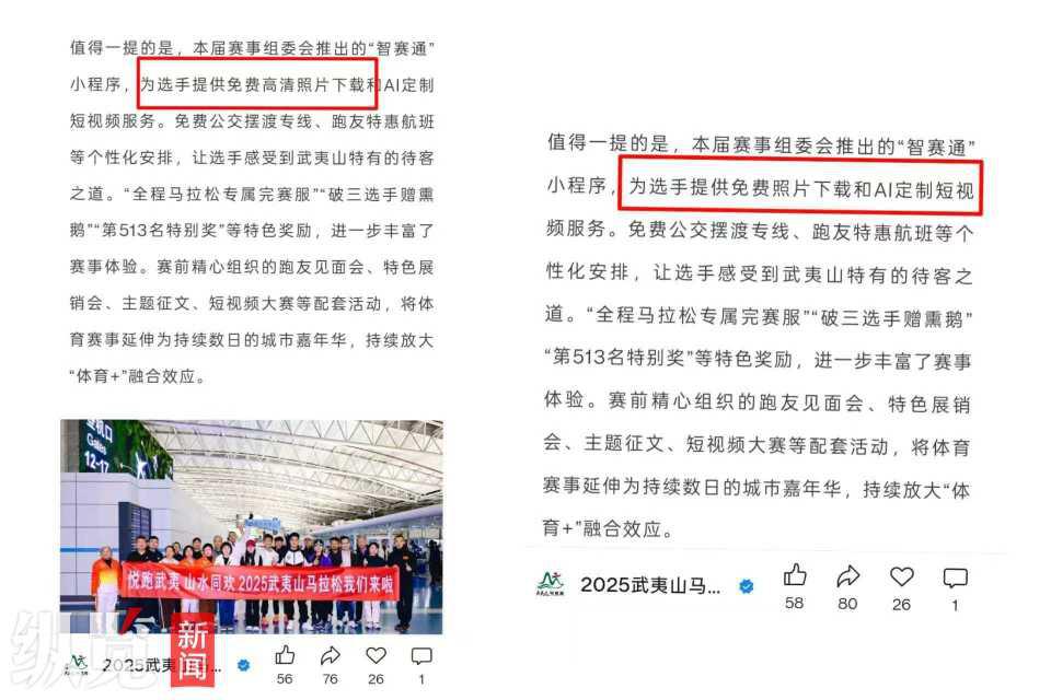 记者查询到,网友所说的武夷山马拉松 " 提供免费高清照片下载 " 的说法来源于官方公众号一篇推文。据 "2025 武夷山马拉松 " 官方微信公众号 23 日发布的名为《2025 武夷山马拉松圆满举办》的文章提到," 本届赛事组委会推出的‘智赛通’小程序,为选手提供免费高清照片下载和 AI 定制短视频服务 "。