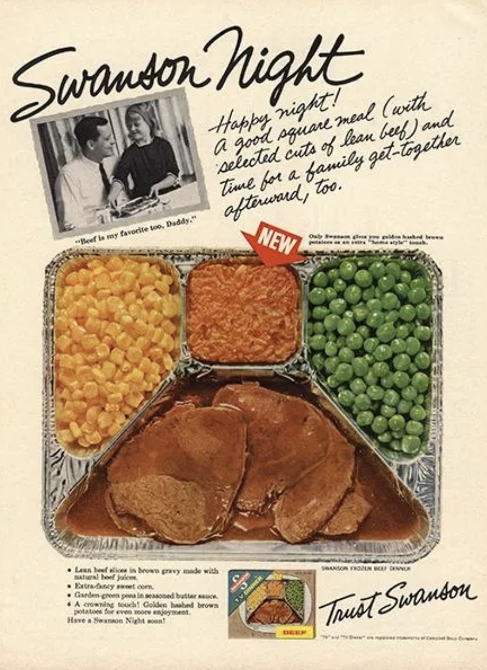 20世纪后期,电视占据了美国家庭娱乐的核心地位,肥皂剧、黄金档成为诸多家庭的佐餐伴侣,其间插播的食品广告精准投放,赚足了眼球。食品保鲜技术、规模化运输以及大众传播的兴起将快餐推到家庭餐桌的“C位”。“看电视的习惯、上班的妈妈和宠坏的孩子三者联合起来,钝化了美国人的美食鉴赏力”,越来越多的女性从家庭走向了职场,微波炉加热即食的预制食物节省了人力和时间成本,取代了新鲜食材。甜甜圈宠溺着孩子,为了不错过电视上的精彩瞬间,快餐和外卖就成了家庭餐桌的首选。