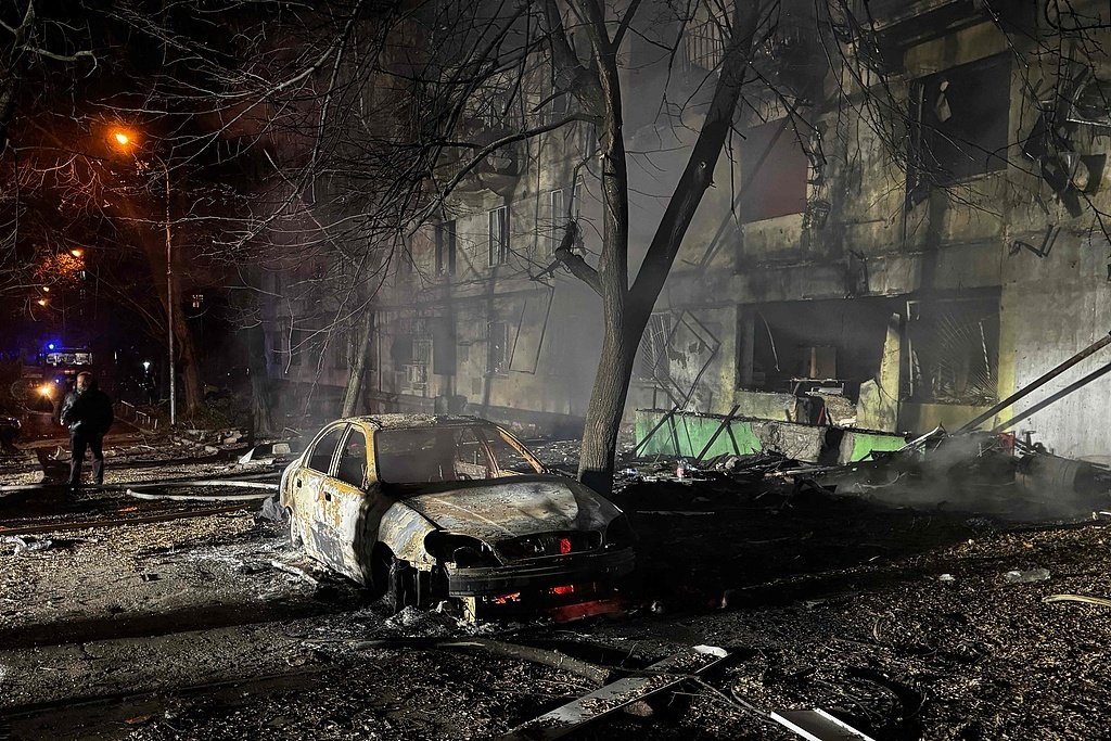 当地时间2025年11月25日,乌克兰扎波罗热地区,俄乌冲突持续,一栋居民楼在空袭后燃烧,当地居民在一旁围观。