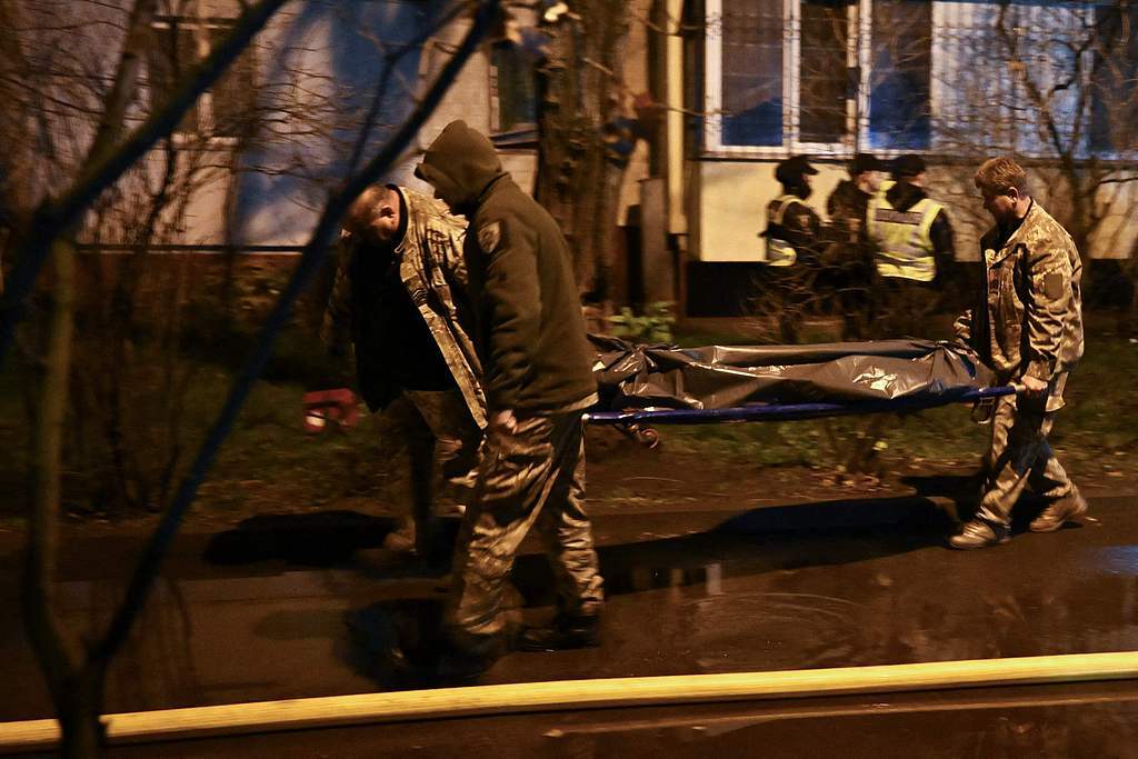 当地时间2025年11月25日,乌克兰基辅,乌克兰执法人员在空袭后搬运一具遇难者遗体。