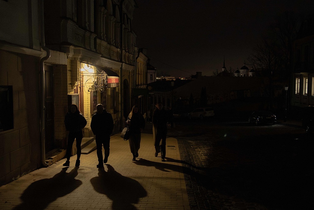 当地时间2025年11月25日,乌克兰基辅波迪尔区,在俄罗斯对乌克兰能源基础设施发动导弹和无人机袭击后,当地部分地区停电,人们在未照明的街道上行走。