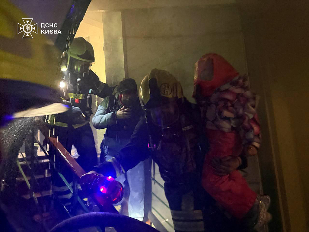 当地时间2025年11月25日,乌克兰基辅,俄罗斯导弹和无人机袭击后,消防员正在帮助居民从受损的居民楼中撤离。