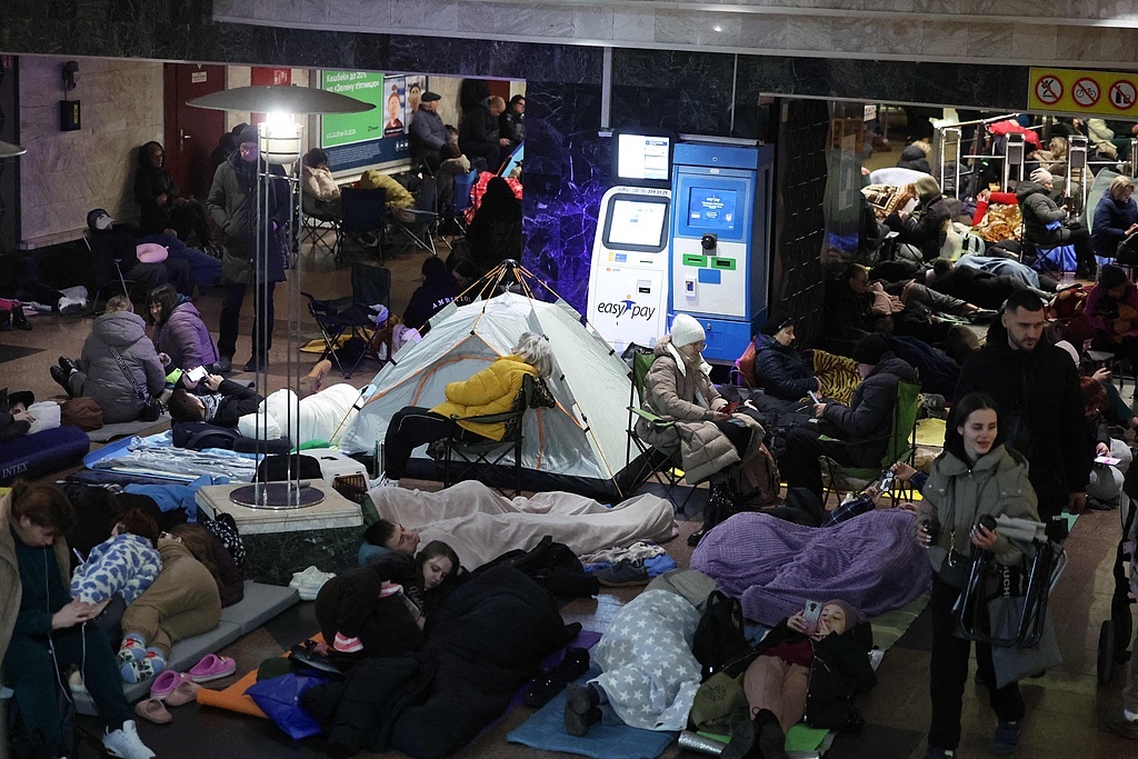 当地时间2025年11月25日,乌克兰基辅,俄乌冲突持续,在俄罗斯空袭期间,人们在地铁站内躲避。