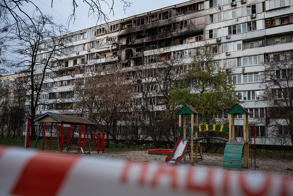 当地时间2025年11月25日,乌克兰基辅,一栋居民楼在俄罗斯夜间无人机和导弹袭击中受损。