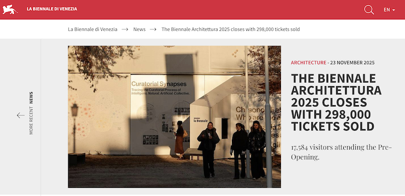 澎湃新闻了解到,2025年,由卡洛·拉蒂策展的第19届威尼斯国际建筑双年展于11月23日闭幕。据数据统计,该展览共售出29.8万张门票,较2023年的第18届建筑双年展增长5%,并有17,584名观众参加了预展,成为威尼斯双年展有史以来参观人数最多的一届。