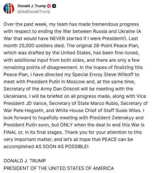 根据金融时报披露,威特科夫和库什纳向乌梅罗夫转交了 28 点和平计划,乌梅罗夫则当场致电泽连斯基,按着免提,一字一句读给泽连斯基。据说泽连斯基惊掉了下巴,随后提议在日内瓦面谈。