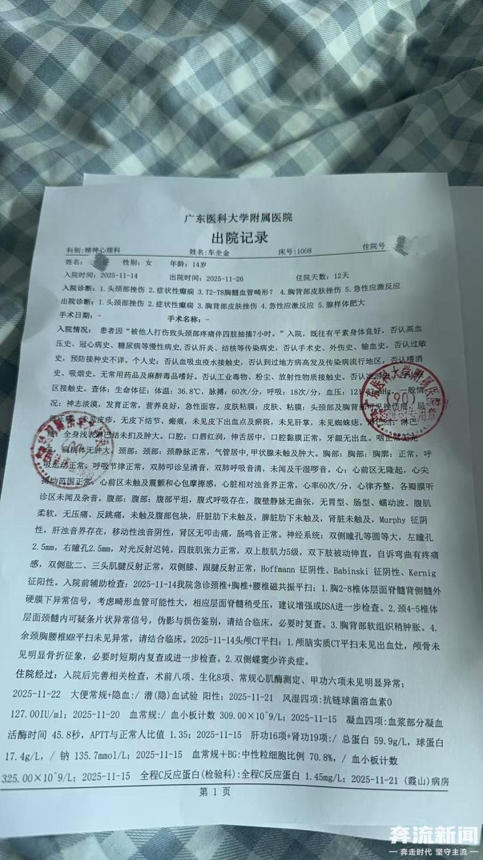 奔流新闻讯(记者玄丝雨)近日,广东的朽女士向奔流新闻记者反映,其侄女车某为广东雷州市英利中学九年级学生,11 月 12 日晚自习被老师体罚后突发癫痫住院,目前已从当地医院转至广东三九脑科医院治疗。