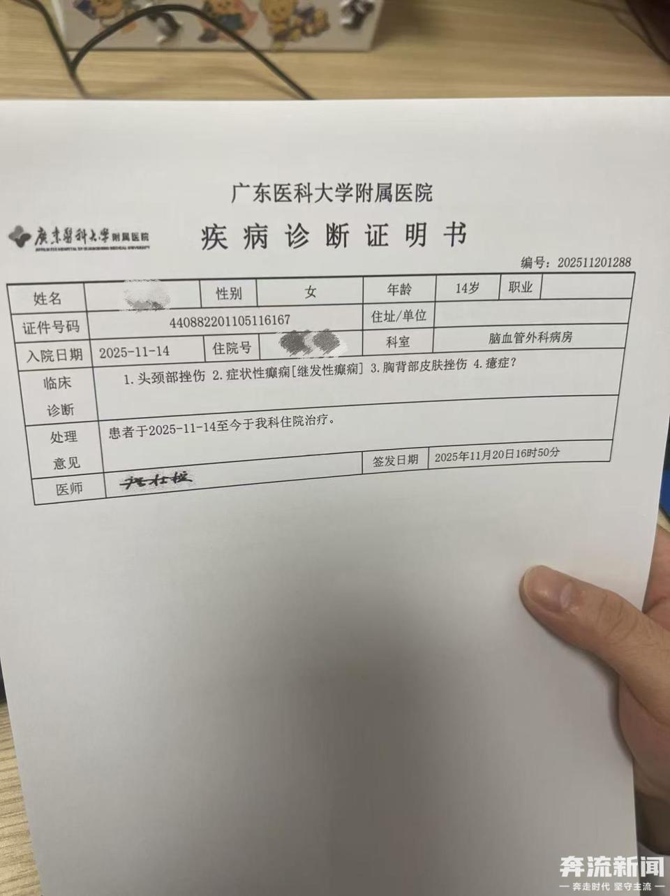 朽女士称,送医途中,车某先后被英利中心卫生院、雷州市仁康医院拒收,最终被广东医科大学附属医院接收治疗,截至 11 月 25 日已住院 14 天。医院出具的疾病诊断证明书显示,车某确诊为头颈部挫伤、症状性癫痫(继发性癫痫)、胸背部皮肤挫伤,同时标注癔症待查。朽女士表示,事发前孩子极少生病,如今癫痫发作毫无规律,病情始终未见好转,家人十分担忧。