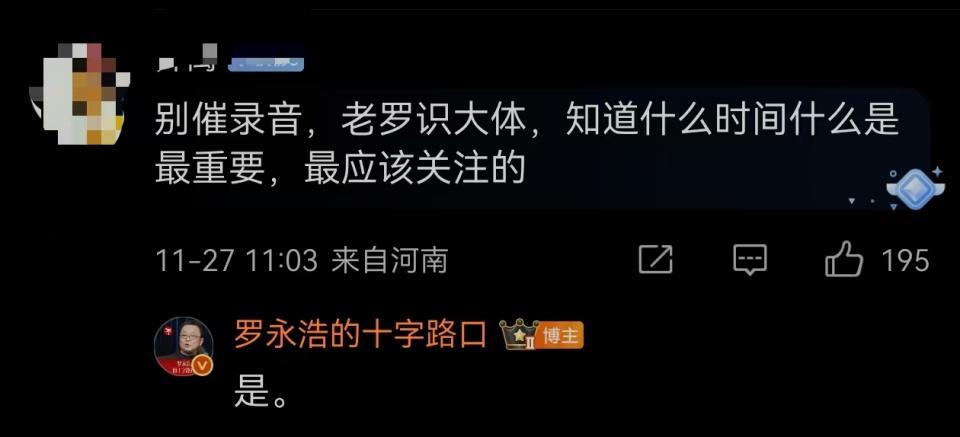 11 月 26 日,罗永浩发微博称如果华杉没有在晚上 6 点前道歉,将公布录音,但昨晚罗永浩一直迟迟未公布。11 月 27 日,很多网友在罗永浩微博评论区就此事提问,罗永浩也一一做了回应。