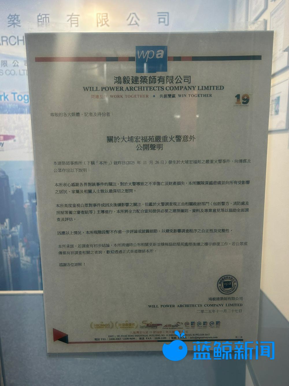 随后记者来到鸿毅建筑师有限公司,发现其在办公室门外张贴了公开声明,称该所高度重视公众对事件成因及后续影响的关注,但鉴于火警调查现正由相关政府部门主导进行,该所将全力配合当局提供必要之建筑图则、资料及专业意见等以协助全面调查及评估。" 因应以上情况,本所现阶段暂不作进一步评论或披露细节,以避免影响调査程序之公正性及完整性。本所承诺,若调查有初步结论,本所将适时公布相关更新并积极协助屋苑处理后续之楼宇修复工作。" 该声明显示。