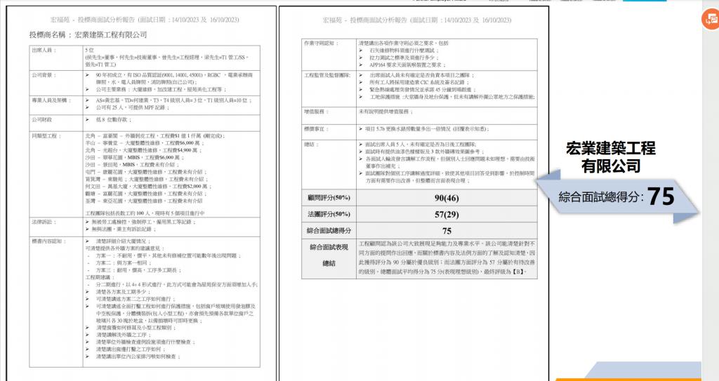 2023 年 10 月,法团管委会面见了包括宏业建筑在内的 14 间回标承建商,宏业建筑综合面试总得分为 75 分,评级为 B,面见后最终有 5 间承建商符合要求。2024 年 1 月 28 日,业主大会议决拣选宏业建筑为强制验楼计划的修葺工程承建商。