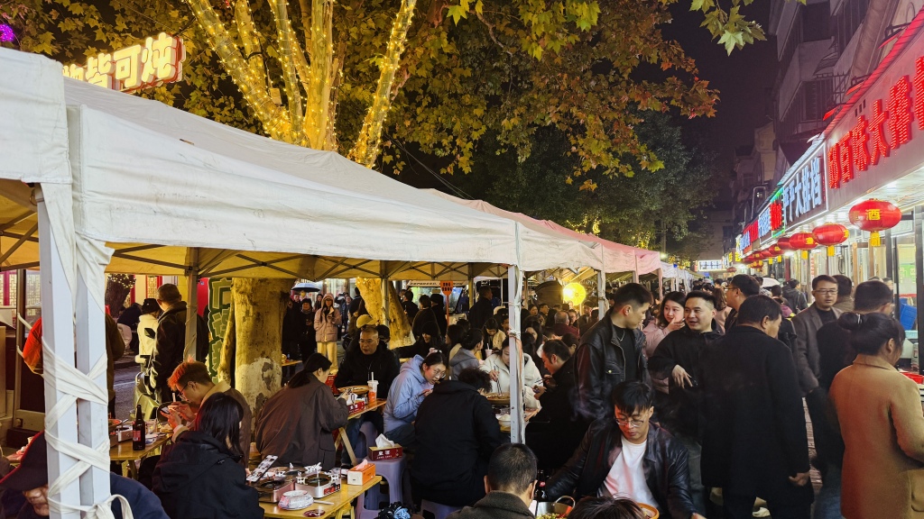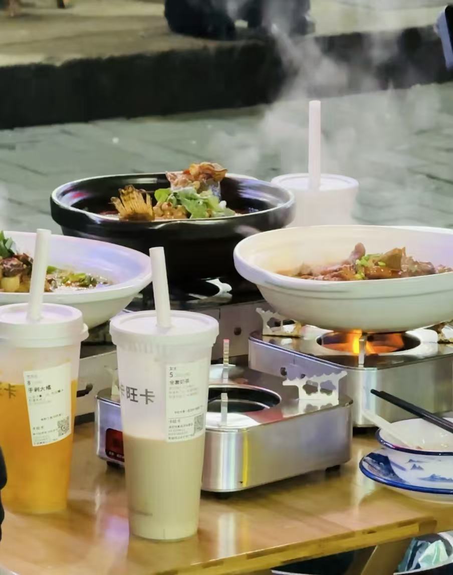 屋外,人声鼎沸。多家大排档的桌椅排成一行,摆上冒着热气的炖锅,像是一场场赶赴盛宴的流水席,食客换了一拨又一拨。每张桌子都有自己的热闹。有的聊工作上的合作,有的聊生活的趣事,有的在直播带货。