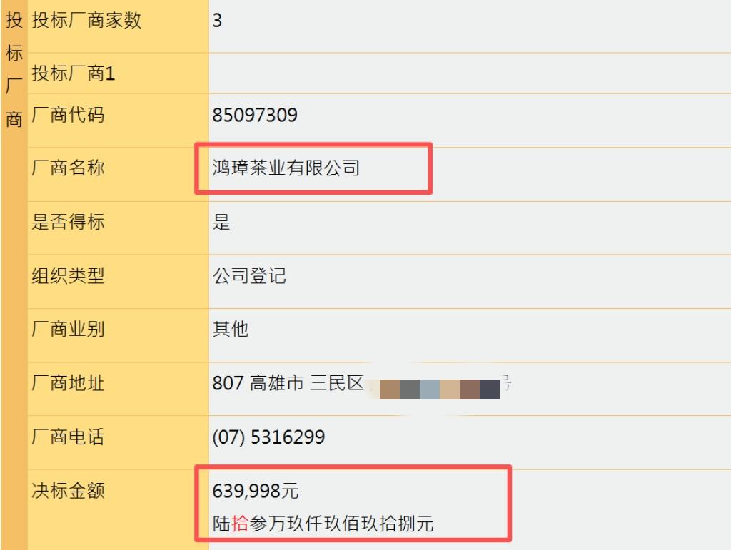 台当局公开招标网站显示,鸿璋茶业公司中标