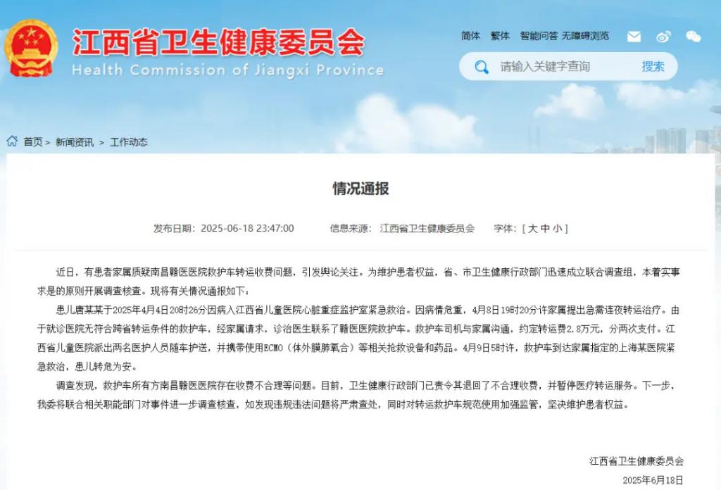 江西省卫健委 2025 年 6 月 18 日关于 " 天价救护车 " 事件发布的情况通报