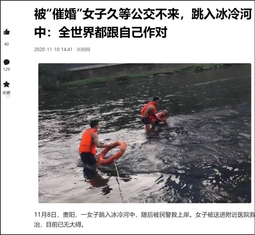 2020 年的一起案例里,催婚压力裹挟着其他不顺,另一位女生决定跳入冰冷河水中。