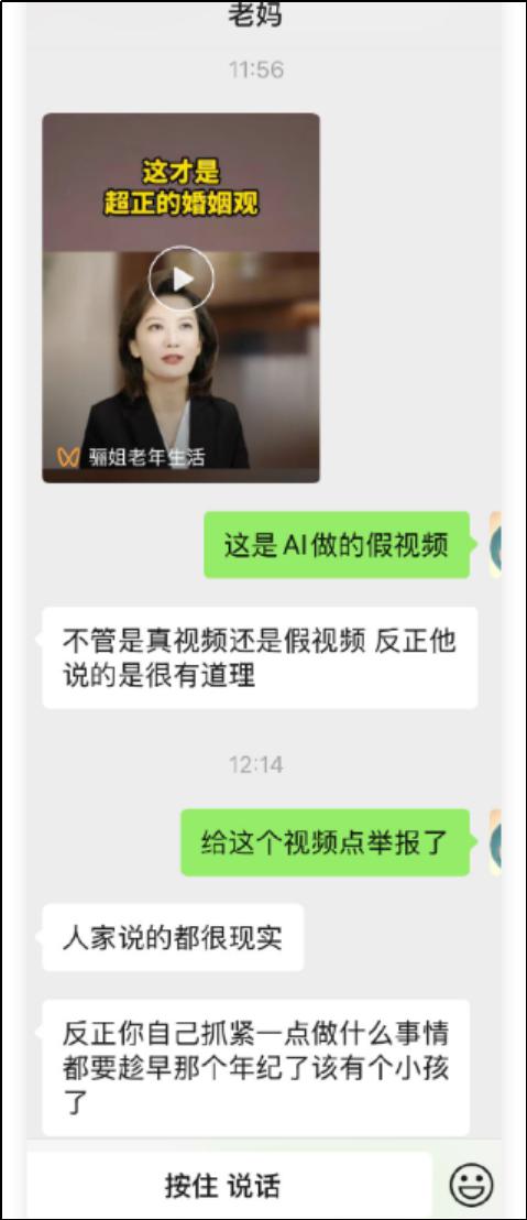 有网友不信,把视频发给老妈,老妈又来了一句,我不管视频真假,但你就是要趁早生小孩。