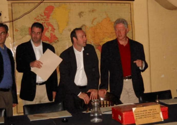 还有一张照片显示,克林顿及其前顾问道格 · 班德、知名演员凯文 · 史派西在位于英国伦敦的地下内阁会议室内。CNN 称,这张照片似乎拍摄于 2002 年 10 月,当时克林顿乘坐爱泼斯坦的私人飞机前往非洲,途中在伦敦停留,同行者是史派西和演员克里斯 · 塔克(Chris Tucker,《尖峰时刻》主演之一)。