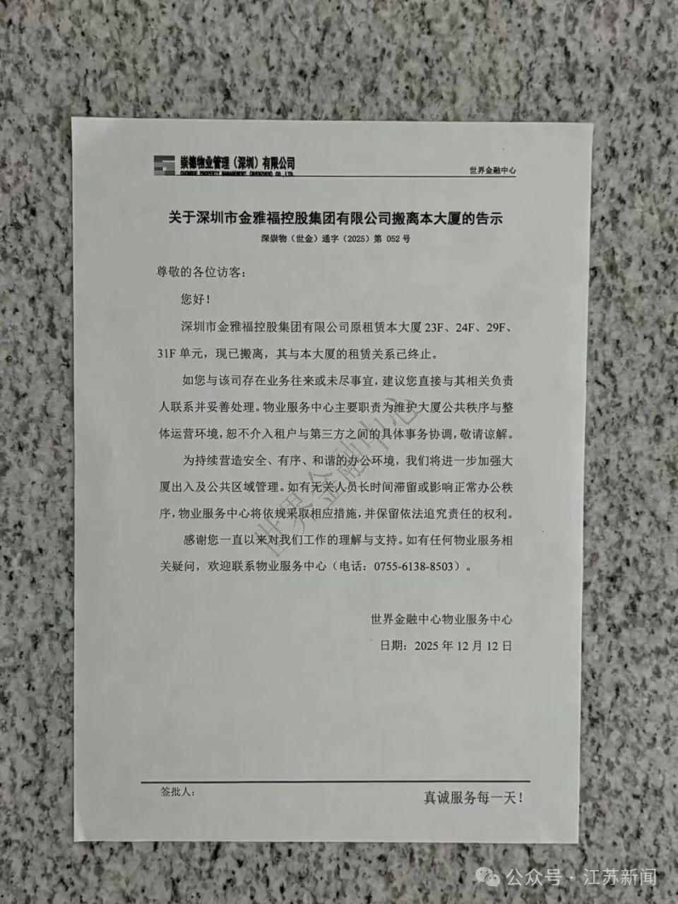 12 月 17 日,有媒体记者来到金雅福官网显示的公司总部地址——世界金融中心大厦 A 座 29 楼,看到办公室大门敞开,室内几乎被搬空,只剩部分柜子和杂物。在前台位置," 金雅福 " 相关字样已摘下,依稀可见此前痕迹。