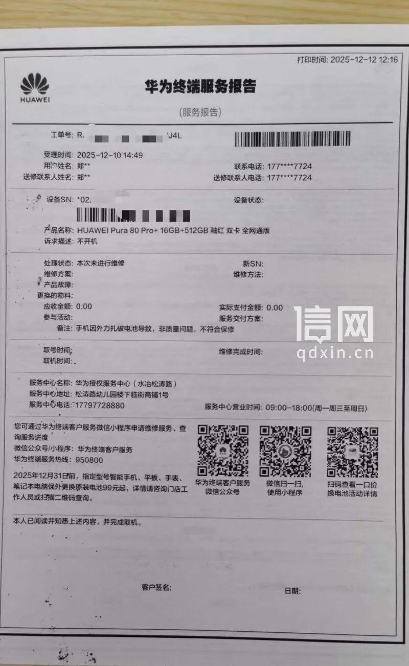 郑先生告诉信号新闻,他当场拒绝了华为售后提出的 " 需自行承担维修费用 " 的方案,坚持 " 全额退款或更换新机 " 的诉求,双方未能达成一致。