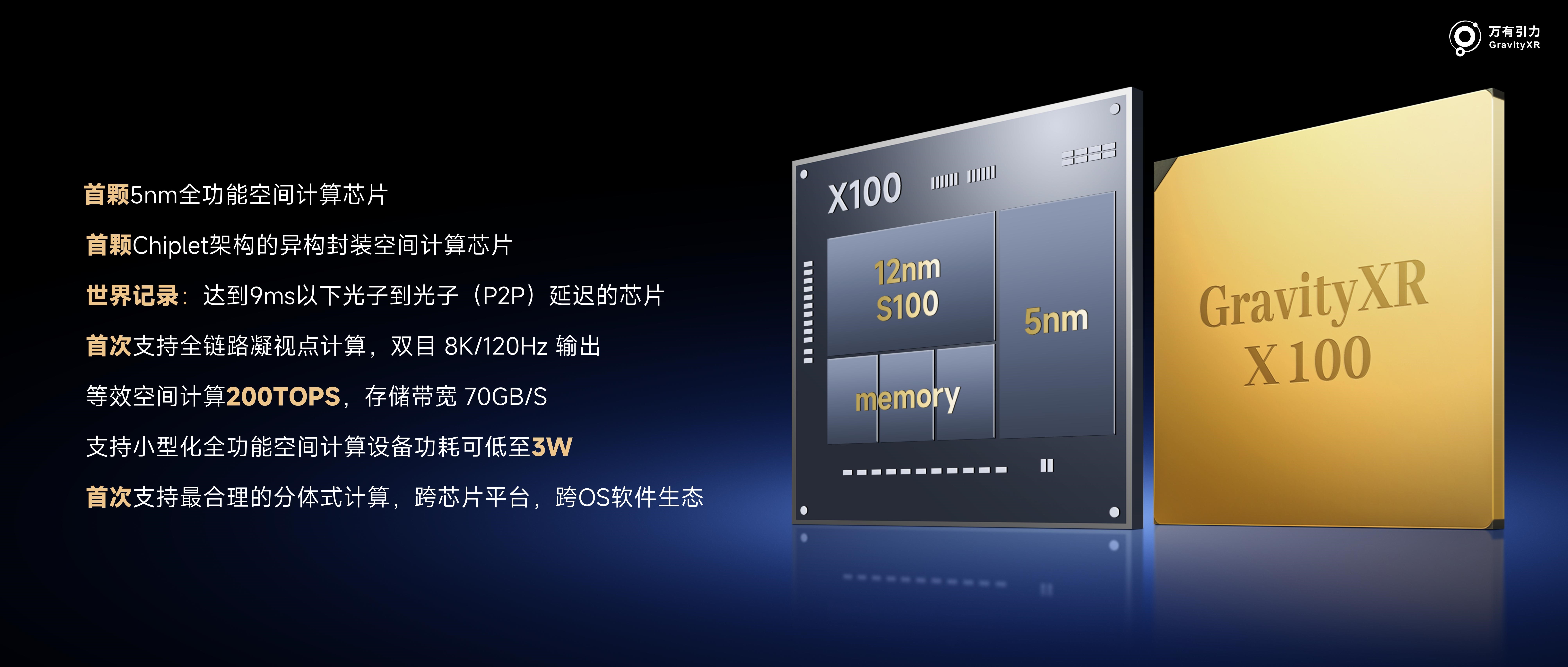 除了旗舰芯片G-X100,万有引力同步发布的另外两款芯片拓展了空间计算技术在不同场景的应用版图。
