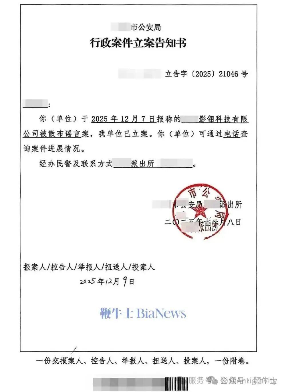 经公司报案,公安机关已正式立案,并已查实包括某自媒体账号在内的主体存在发布虚假信息、误导公众的行为。