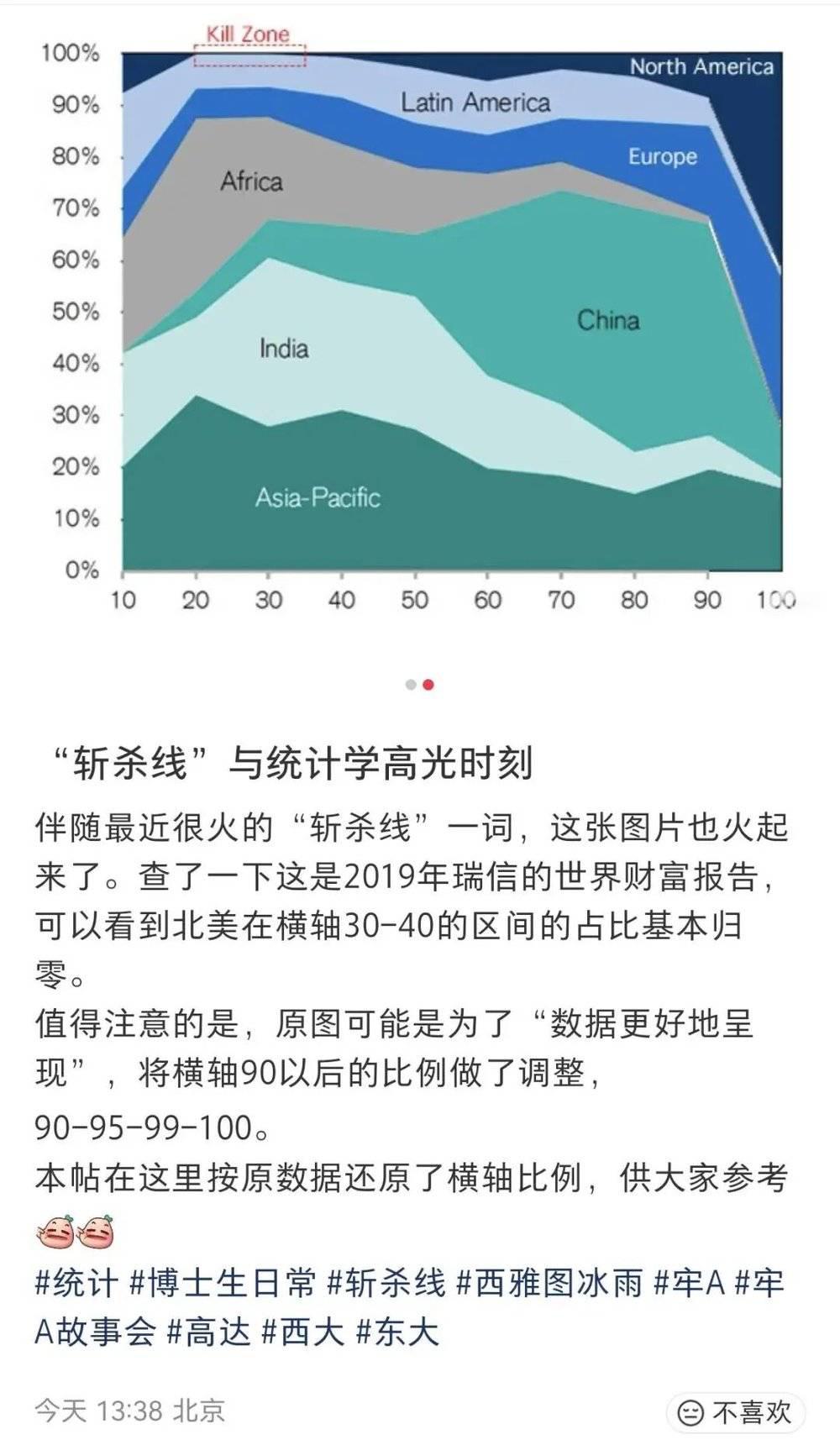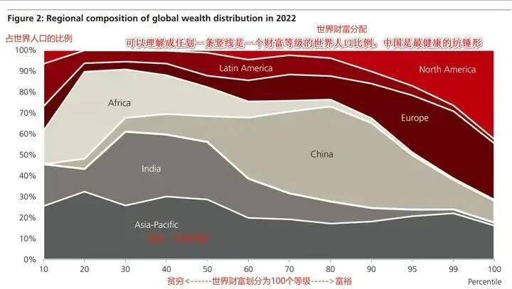 还有,想必下面这两张图这几天已经很多人看到了,这同样不是我们统计的数据,甚至也不是最新的数据。无论你怎么定义 " 斩杀线 " 这个概念,美国在财富分布后 20%-40% 的分布都足够让人侧目。同时在这个统计上可以看出,中国实际上是目前财富结构分布最健康的社会,这无疑要归功于持续脱贫攻坚带来的成果。