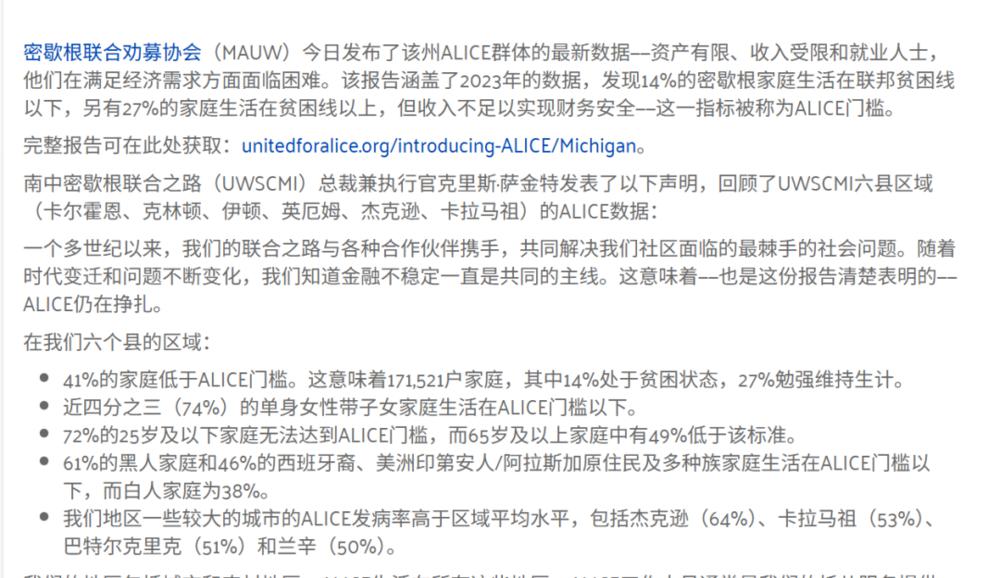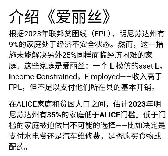 在美国官方的统计数据里,有一个说法叫做 Alice Threshold,翻译过来叫做爱丽丝线。指的就是一个家庭在当地满足基本需要所需的收入,其中 alice 是 Asset Limited, Income Constrained, Employed 的简写,意思是没多少积蓄,没多少收入,但是有工作。按照美国的统计,不同地区大概会有 20% 到 40% 的人口处于爱丽丝线之下,这意味着他们可能随时因为一场意外变成 homeless,这可是美国官方统计机构提出的标准。