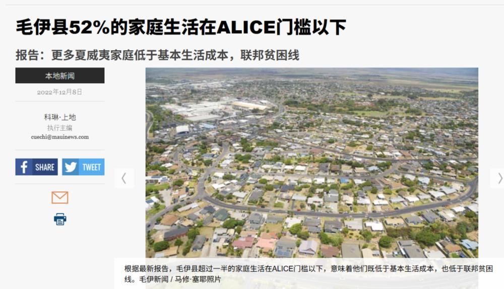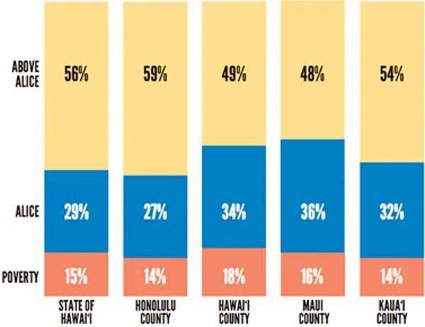 夏威夷的一份调查结果,红色是贫困,蓝色是比贫困高,但是爱丽丝线之下的,黄色是高于爱丽丝线的有钱人