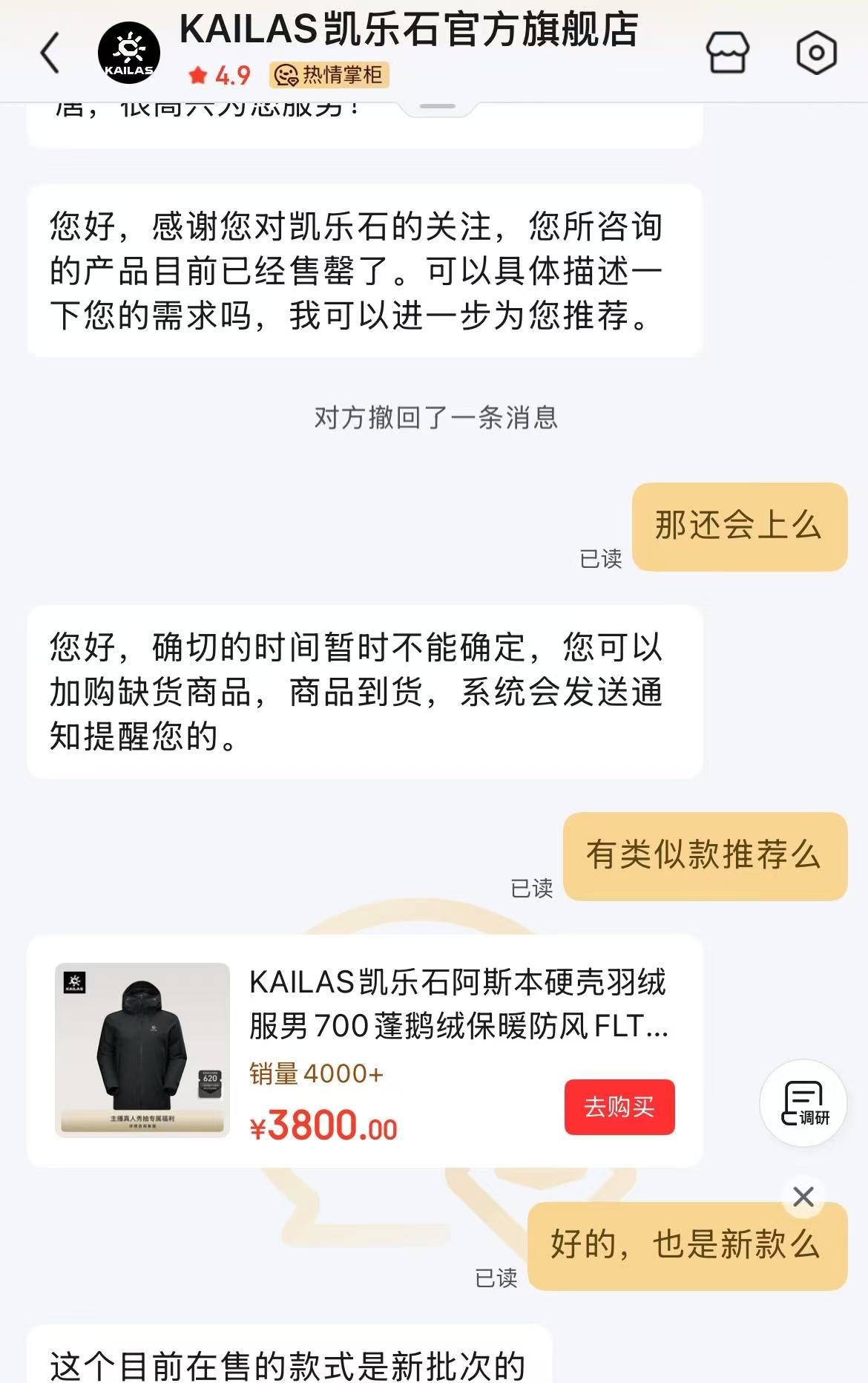 12月26日,界面新闻记者查询凯乐石在两个电商平台的官方旗舰店,搜索“阿尔塔”显示无相关产品信息,店铺客服回应称:该产品目前已经售罄,后续是否还会上架暂时没有收到通知。客服并表示类似设计的款暂时没有,如果选硬壳羽绒服款推荐在售的阿斯本硬壳羽绒服男700蓬鹅绒保暖防风款,售价3800元,两个平台该款销量分别是3000+和4000+。