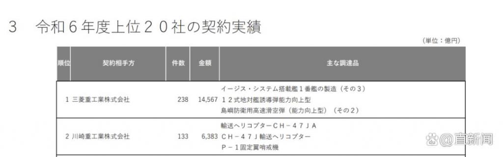 根据日本防卫省装备厅 2024 财年的采购报告,川崎重工的合同金额高达 6383 亿日元(约合 41 亿美元),位居第二,仅次于三菱重工,相较上一财年增长约六成。