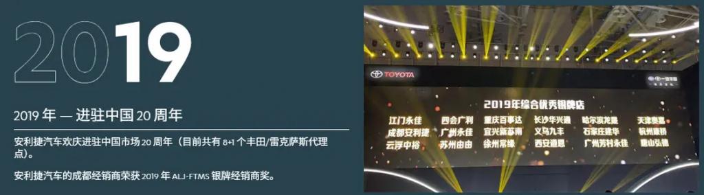1998 年,安利捷的丰田经销业务落地中国。2024 年,一汽 - 丰田汽车销售年度经销商大会上,安利捷获得 " 杰出经销商团体 " 奖,该奖项从与一汽 - 丰田汽车销售合作的 100 多个经销商团体中评选而出。