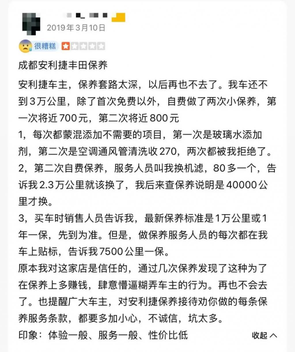 不过,第三方点评平台上却呈现不一样的图景。部分用户在安利捷的主页下留言表示,自己买车时的经历并不愉快,包括销售事先承诺低价但买完 3 天便发现有极大活动优惠,买卡罗拉车型被 " 套路 " 一万多,保养时被蒙混添加不需要的项目等。