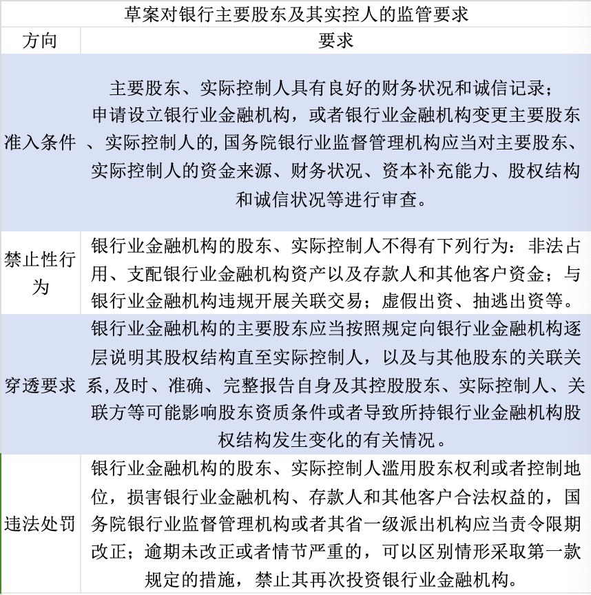 据界面新闻记者梳理,此次草案强化穿透式监管,将监管对象由银行业金融机构延伸至银行业金融机构的主要股东、实际控制人,并从准入条件、出资义务、禁止性行为、违法处罚等方面对主要股东及其实控人提出要求。