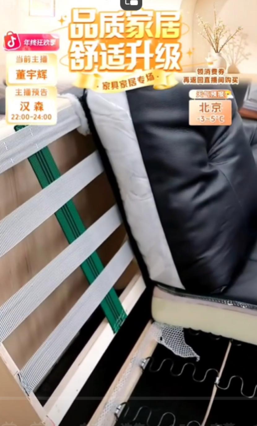 与此同时,当晚董宇辉还在直播间对多款沙发、床等家居产品进行拆解,逐层介绍材质和结构。